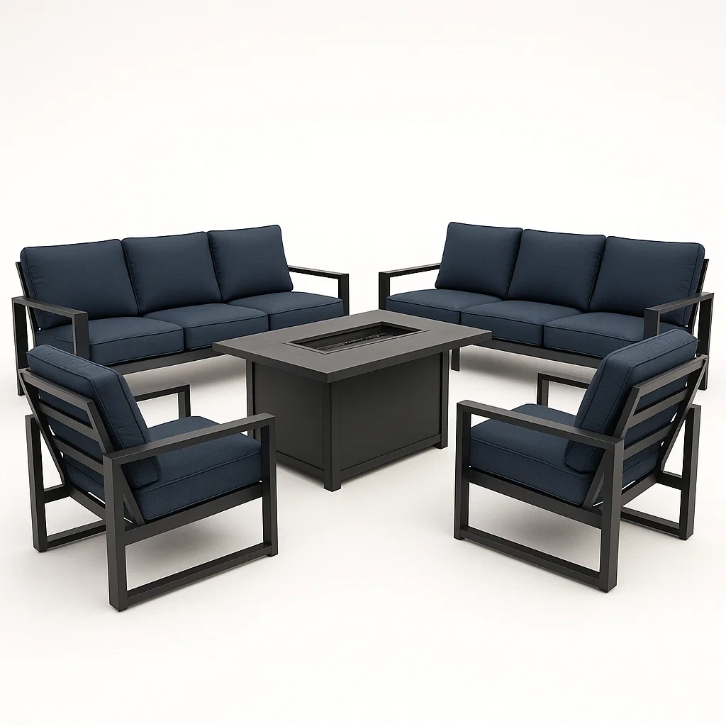 Conjunto de sofá de exterior con estructura de aluminio y cojines de tela azul con mesa de fuego